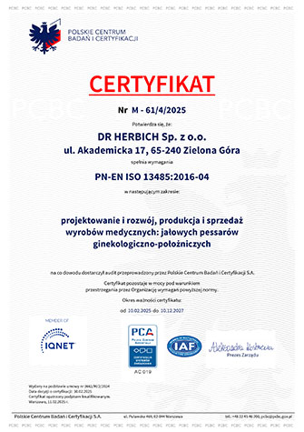 1. Certyfikat na zgodność spełnienia przez  Dr Herbich sp. z o.o. wymagań  EN ISO 13485: 2016-04 w zakresie produkcji i sprzedażny wyrobów medycznych: jałowych pessarów ginekologiczno-położniczych. Dokument Nr M - 61/4/2025 dostępny do pobrania poniżej.
